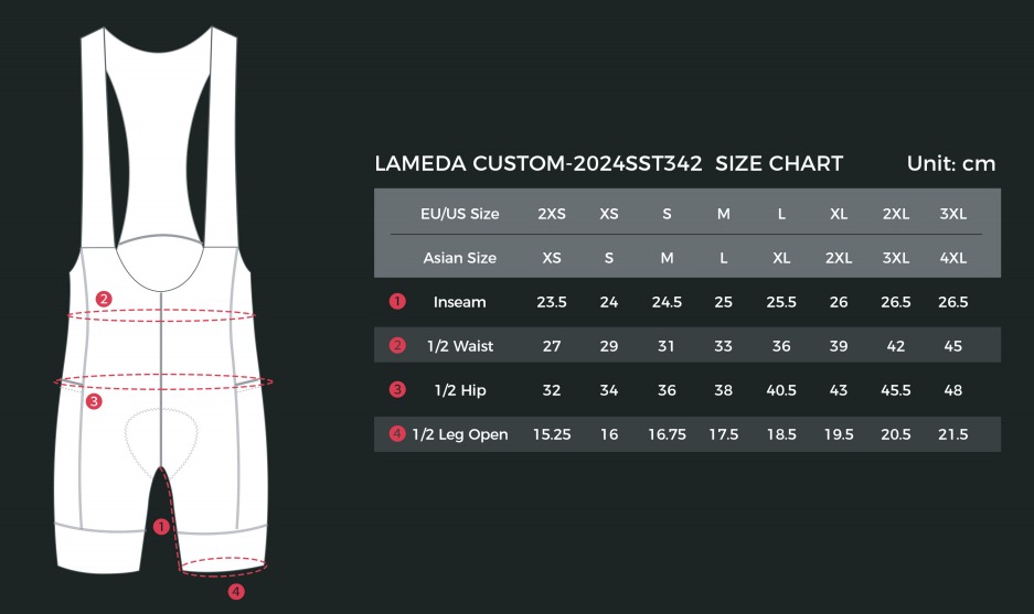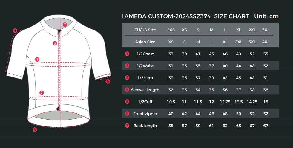 Розмірна сітка Lameda (див EU/US) добре співпадає з іншими брендами одягу. Нижче розміри джерсі надані виробником.